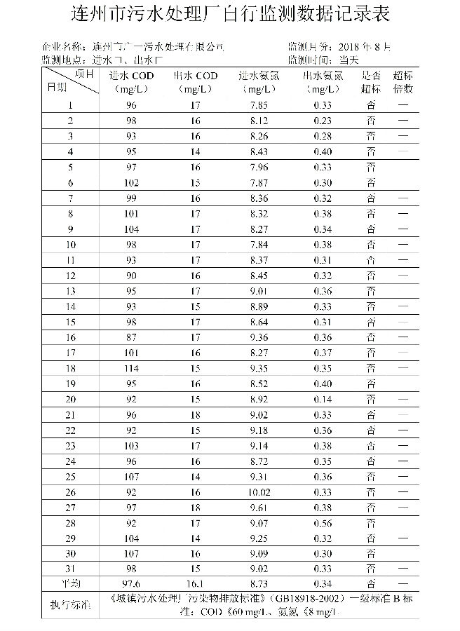 2018年8月自行監(jiān)測數(shù)據(jù)--連州市廣一污水處理有限公司