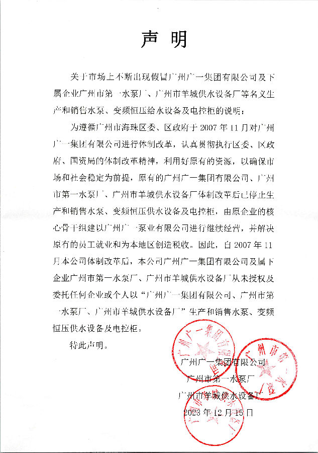 為遵循廣州市海珠區(qū)委、區(qū)政府于2007年11月對廣州廣一集團有限公司進行體制改革,認真貫徹執(zhí)行區(qū)委、區(qū)政府、國資局的體制改革精神,利用好原有的資源,以確保市場和社會穩(wěn)定為前提,原有的廣州廣一集團有限公司、廣州市第一水泵廠、廣州市羊城供水設備廠體制改革后已停止生產和銷售水泵、變頻恒壓供水設備及電控柜,由原企業(yè)的核心骨干組建以廣州廣一泵業(yè)有限公司進行繼續(xù)經營,并解決原有的員工就業(yè)和為本地區(qū)創(chuàng)造稅收。因此,自2007年11月本公司體制改革后,本公司廣州廣一集團有限公司及屬下企業(yè)廣州市第一水泵廠、廣州市羊城供水設備廠從未授權及委托任何企業(yè)或個人以“廣州廣一集團有限公司、廣州市第一水泵廠、廣州市羊城供水設備廠”生產和銷售水泵、變頻恒壓供水設備及電控柜。特此聲明。